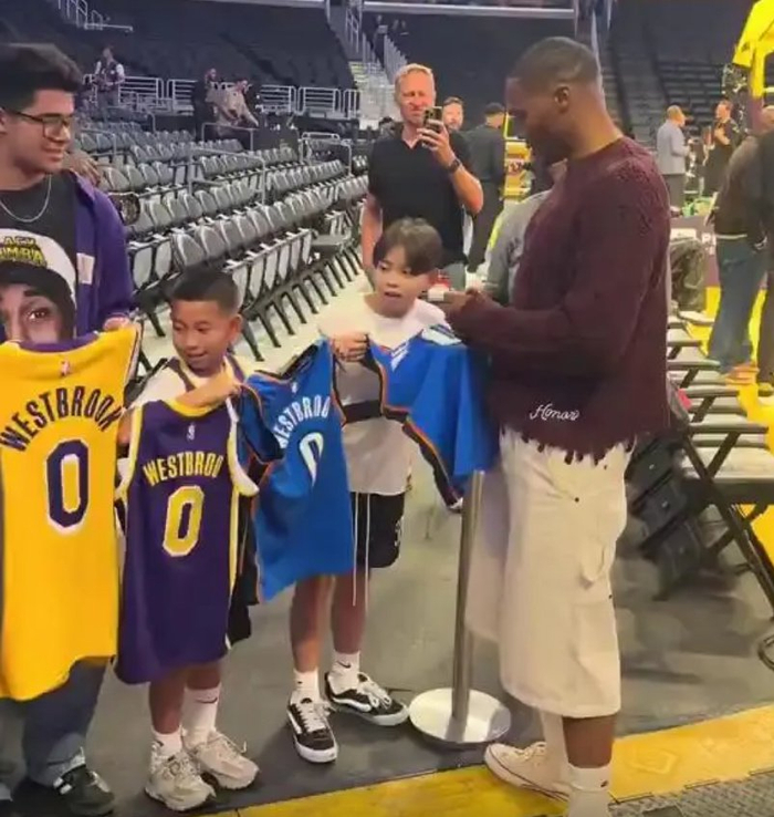 10月18日,国王VS湖人完成季前赛后,国王新援拉塞尔-威斯布鲁克在场边为球迷签名,雷霆球衣、火箭球衣、湖人球衣都有,少爷为球迷签名时唯独跳过了湖人球衣。这个举动引发了热议。