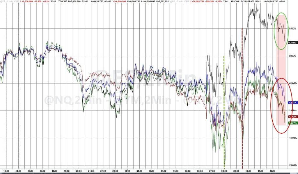 在对AI泡沫的担忧下,周二美股三大指数再度收跌,标普已连续四个交易日下跌。以英伟达为代表的高估值科技股和芯片股普遍承压,拖累纳斯达克综合指数下跌1.2%。